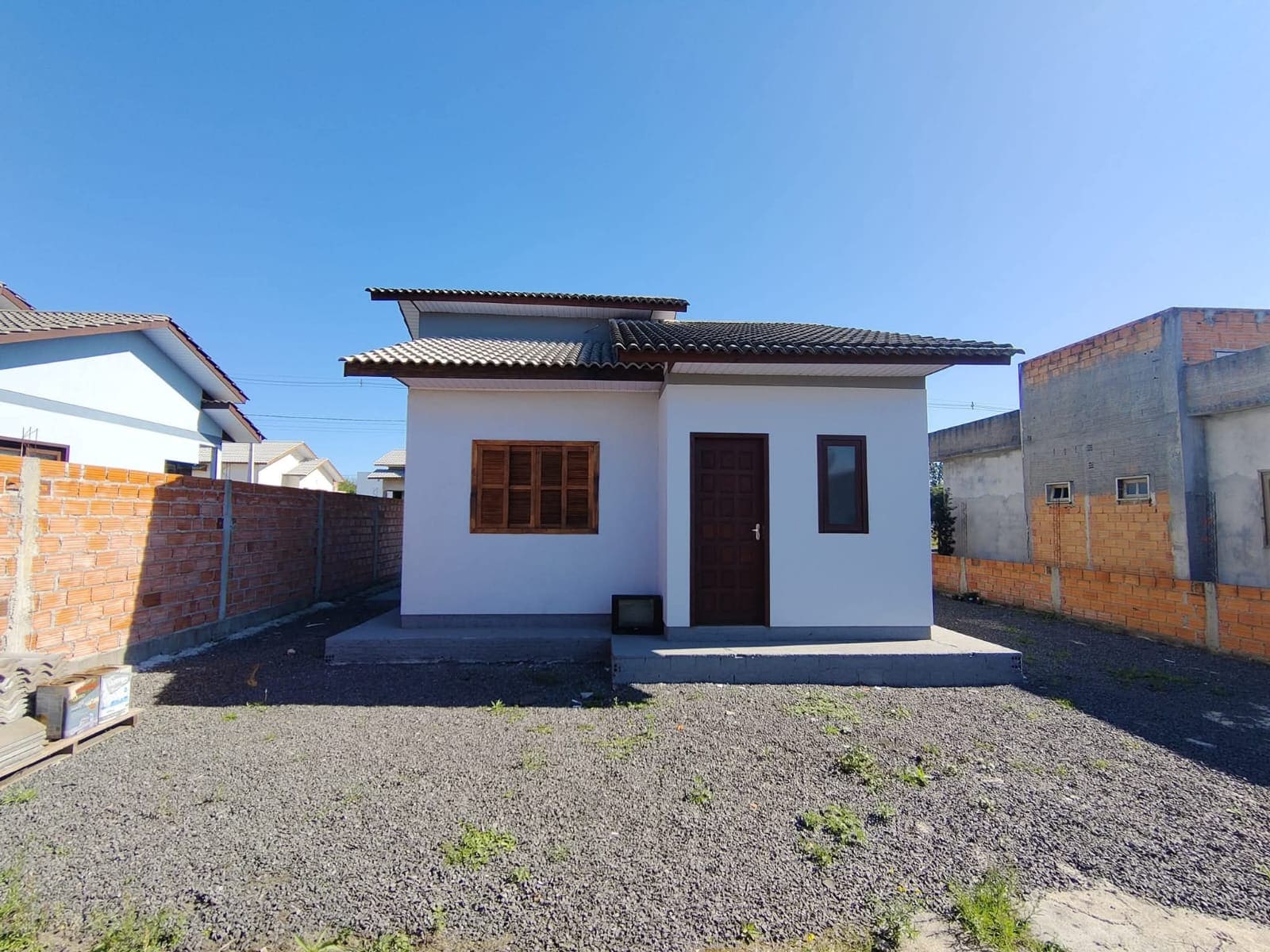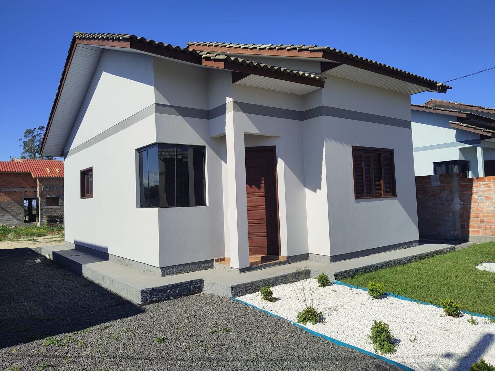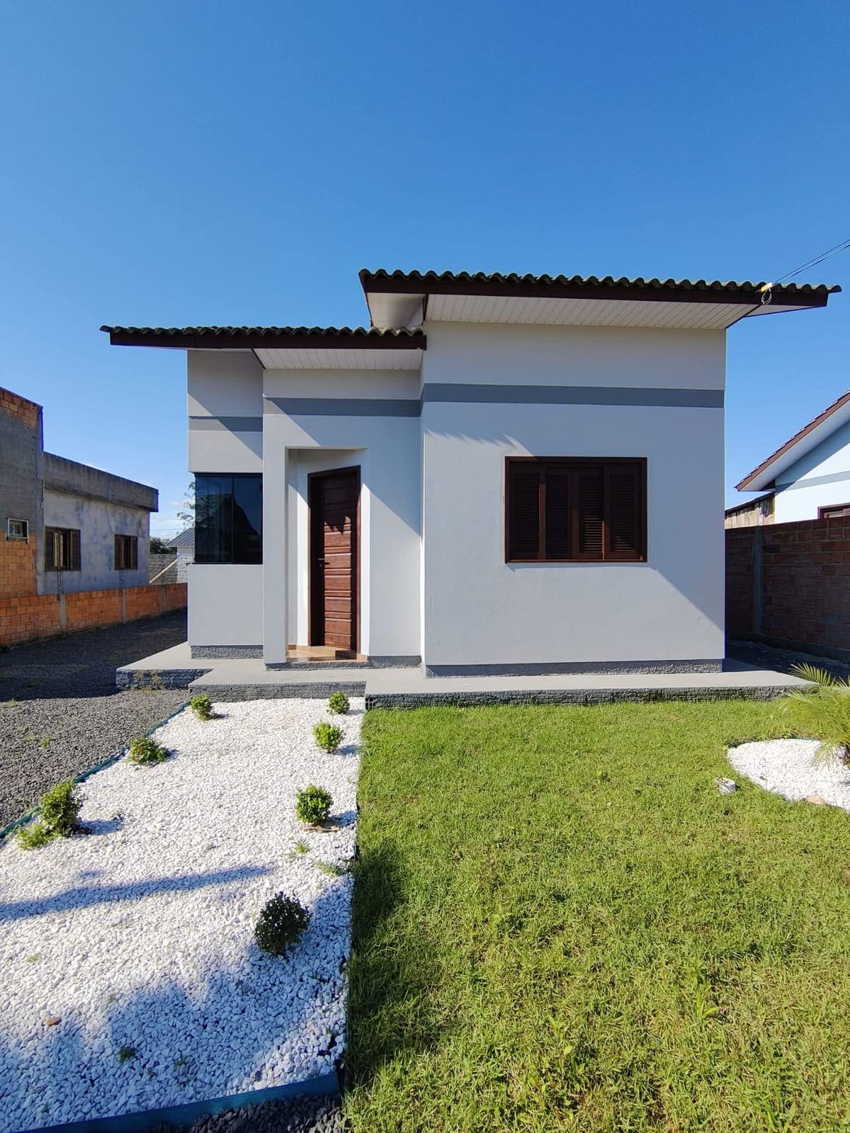 A casa é novinha, muito bem cuidada, com um jardim na frente e muros nas laterais.