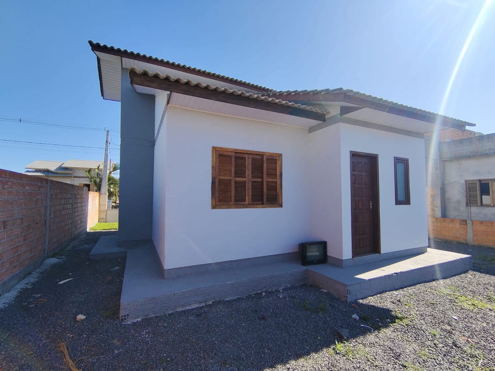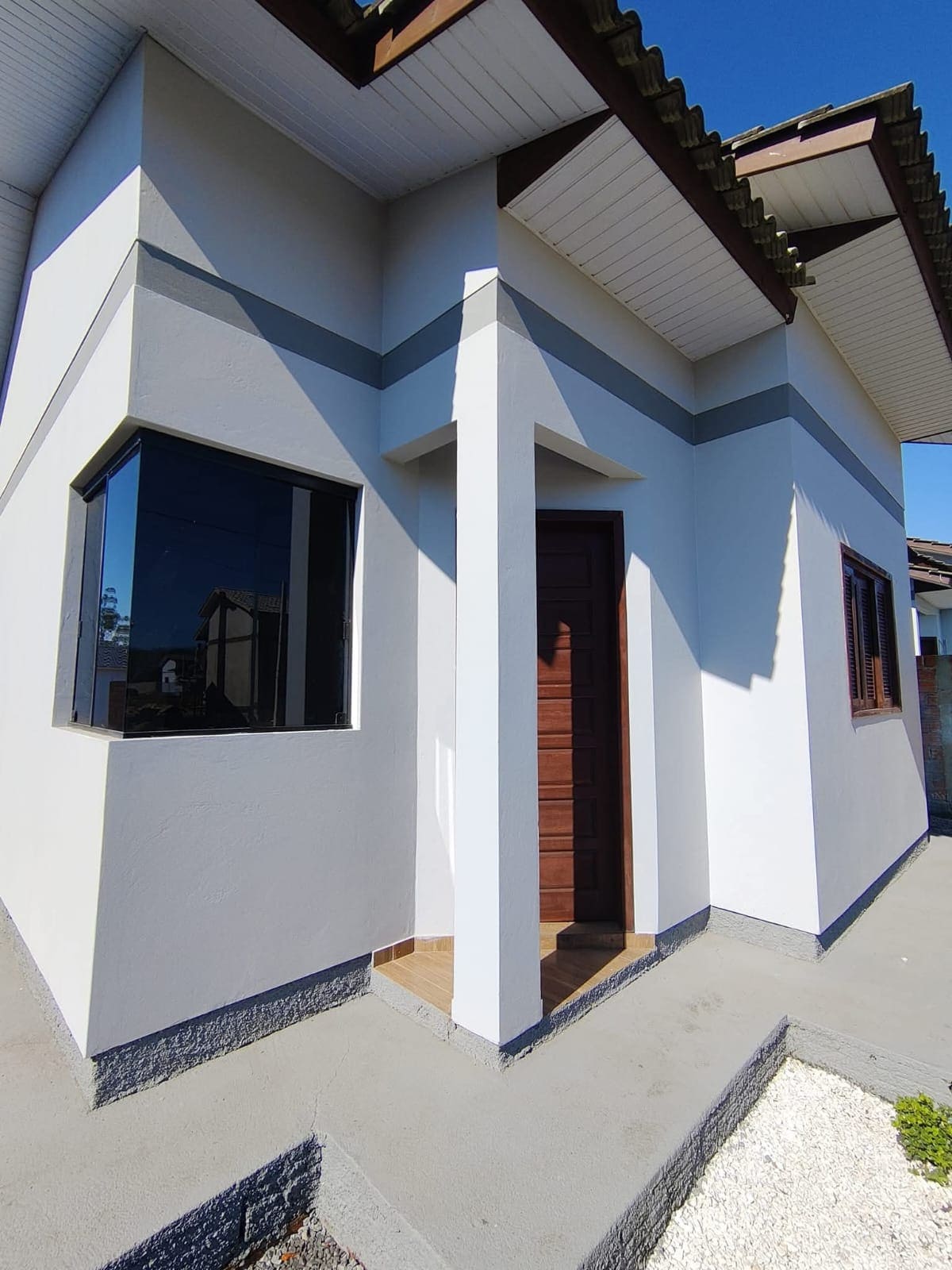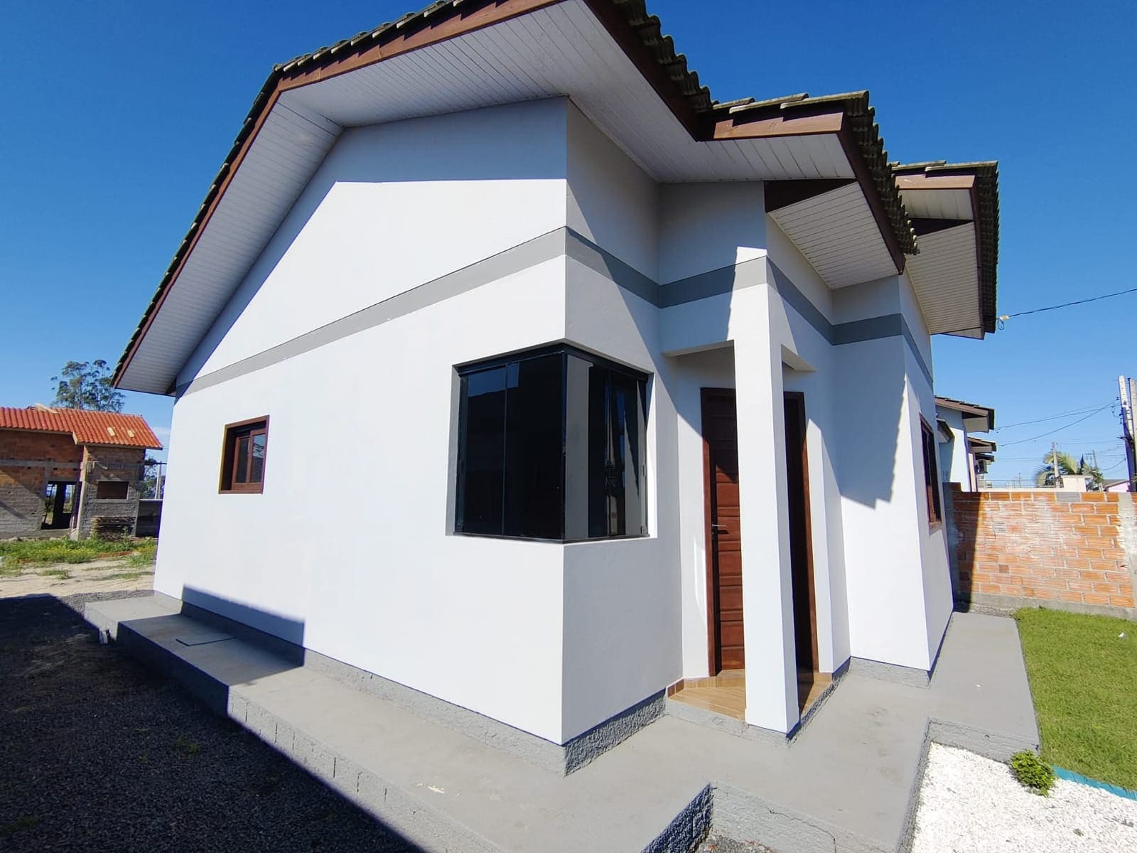 A casa é novinha, muito bem cuidada, com um jardim na frente e muros nas laterais.